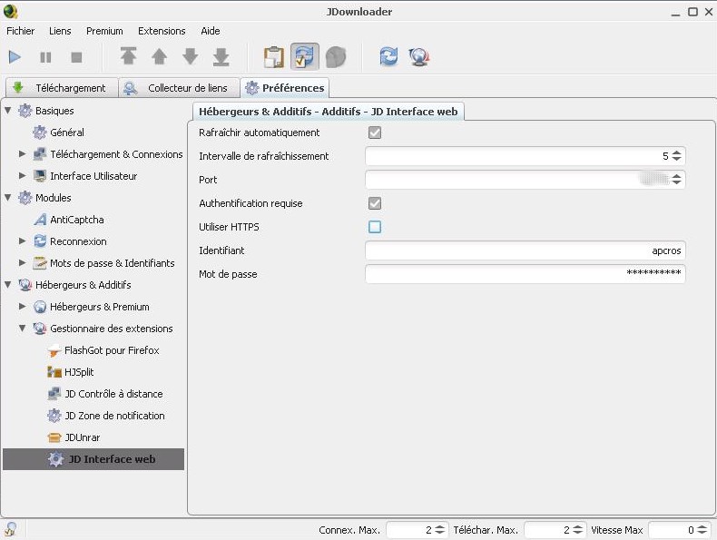 Pour Jdownloader : Préférences > Gestionnaire des extensions > JD interface web
