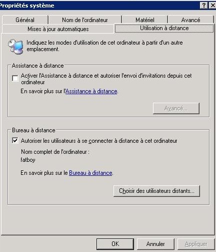 Une fois le beau FatBoy sous Windows Server 2003 il ne faut pas oublier d’aller activer L’accès à distance (Et de configurer le port 3389 en TCP sur votre Box pour l’accès RDP depuis l’extérieur)