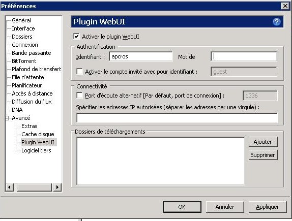 Passons maintenant à utorrent : Options > Préférences > Avancé > Plugin WebUI